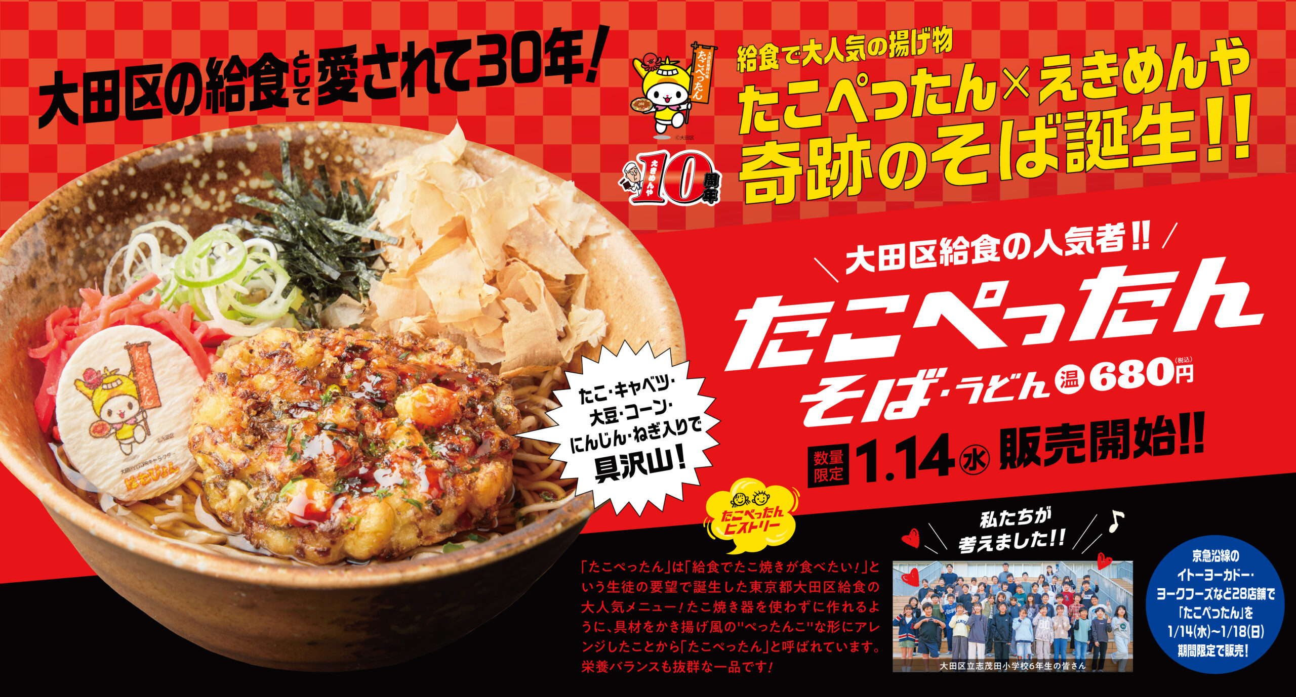 1月14日より 大田区給食で大人気の揚げ物「たこぺったん」をそばにのせた新商品を発売いたしました