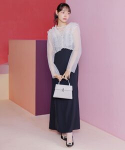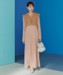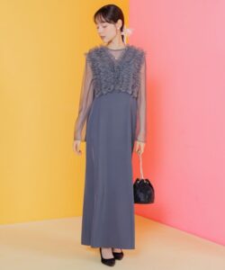 グリッターが華やかなラメチュールを使った立体感が華やかなベストとシルエットの美しさ、細見えにこだわったキャミドレス