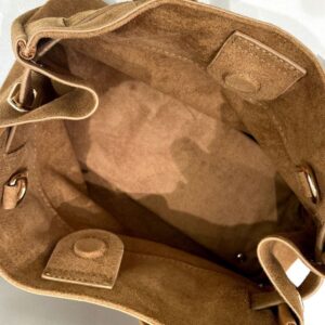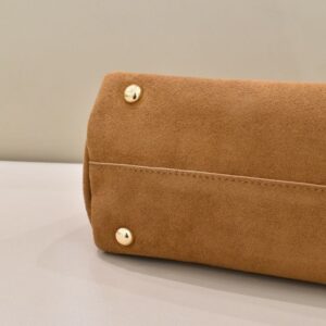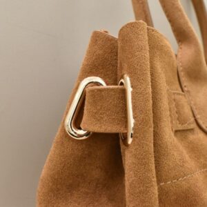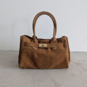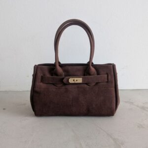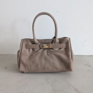 柔らかな風合いのフェイクスエードにゴールドパーツをあしらった高級感のあるデザインで、大人の装いにぴったりです。ハンドバッグとしてはもちろん、付属のショルダーストラップを使えば肩掛けスタイルも楽しめる実用的なアイテムです。