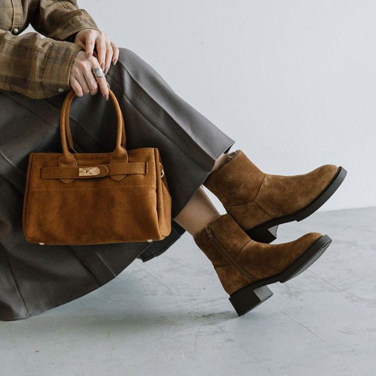 柔らかな風合いのフェイクスエードにゴールドパーツをあしらった高級感のあるデザインで、大人の装いにぴったりです。ハンドバッグとしてはもちろん、付属のショルダーストラップを使えば肩掛けスタイルも楽しめる実用的なアイテムです。