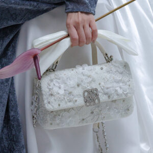 繊細な3Dフラワーやワイヤービーズが儚く上品に煌めくロマンティックなフラップショルダーバッグ。